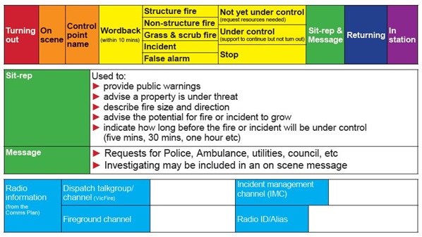 The dispatch radio procedures sticker is designed to be applied to the dashboard of brigade appliances, support vehicles, big fills and FCVs. This is to replace the current “wordback table” sticker.
